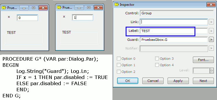 I am using BlackBox 1.7 (built 694). Under Wine (Linux) the label of the Group Box is greyed out via Guard, but it does not under Windows 7 Professional 64 bits.